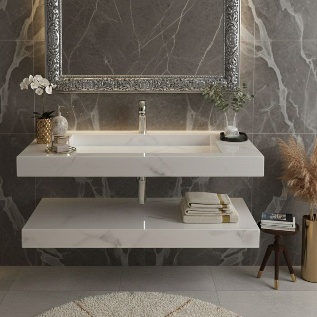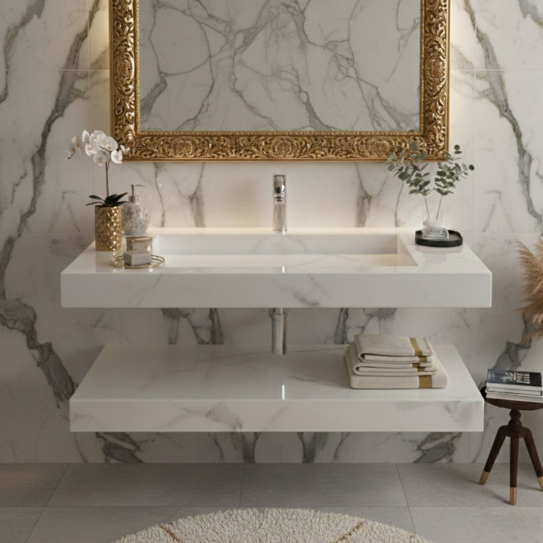 Cuba Esculpida em Porcelanato + Prateleira própio para lavabo.