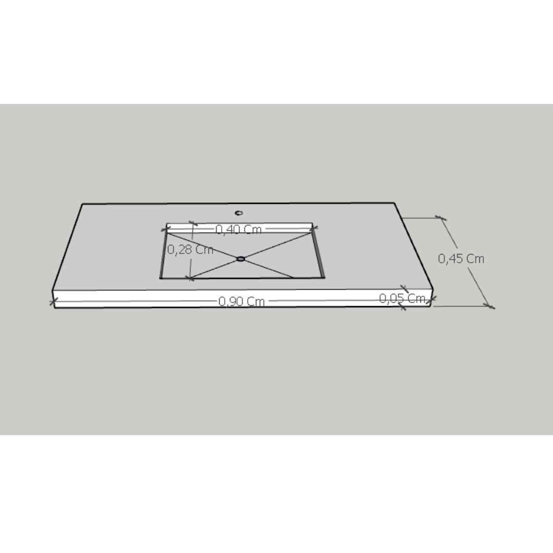 A abertura da cuba é centralizada, com medida 40 x 28 x 0,03.