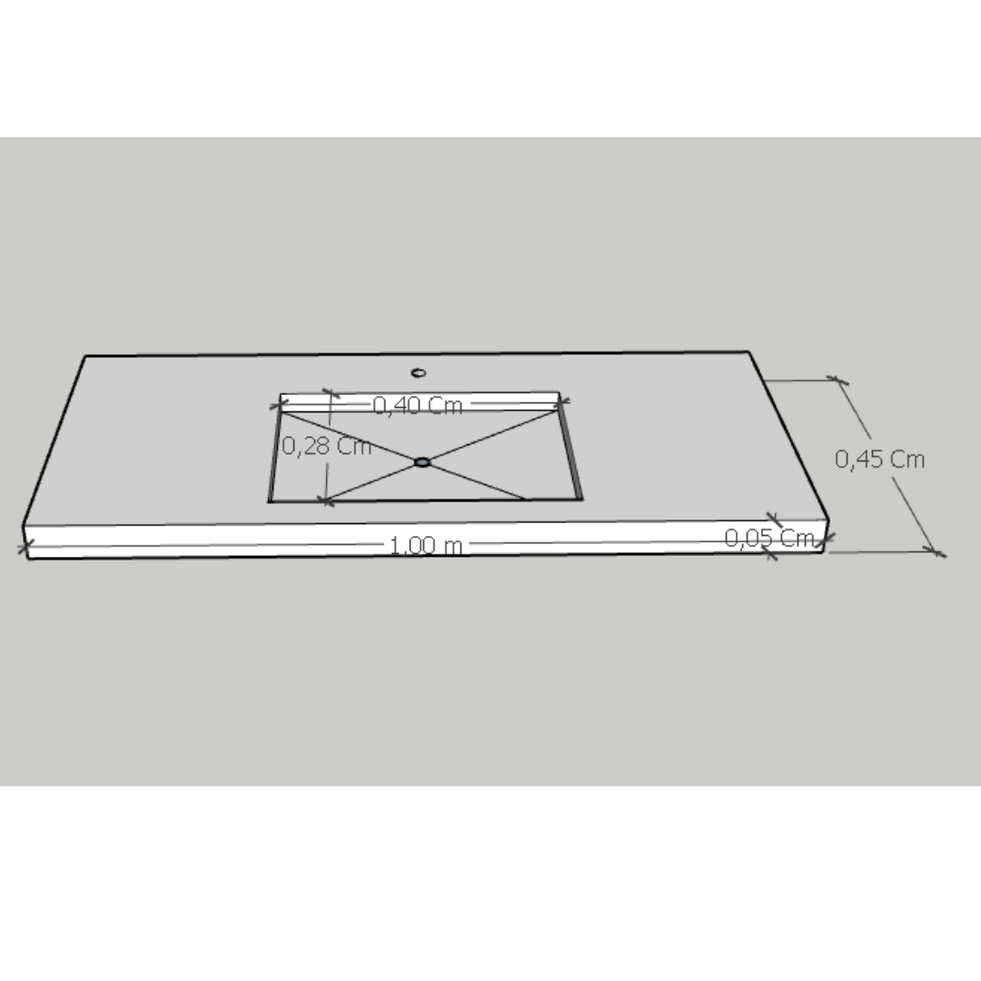 A abertura da cuba é centralizada, com medida 40 x 28 x 0,03.