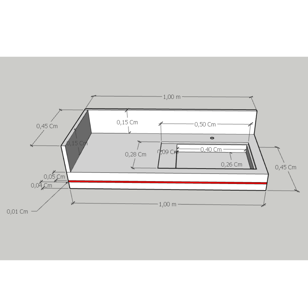 A cuba esculpida possui 1,00 cm de largura, 45 cm de profundidade e 10 cm de altura (saia) acabamento dos dois lados, podendo ser usado tanto numa parede direita ou esquerda,com saia de retorno na cuba esculpida.